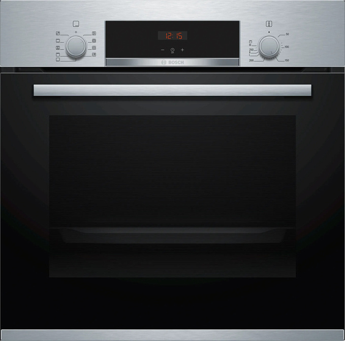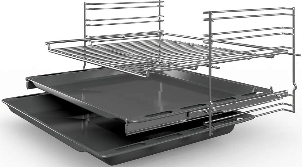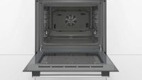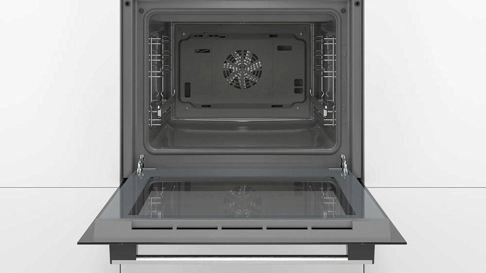 Для безопасности использования в Bosch HBF534ES0Q предусмотрена защита от детей. Дверца шкафа имеет тройное стекло, что обеспечивает дополнительную изоляцию и предотвращает обжиг при касании. В комплект поставки входят комбинированная решетка, эмалированный противень и универсальный противень.